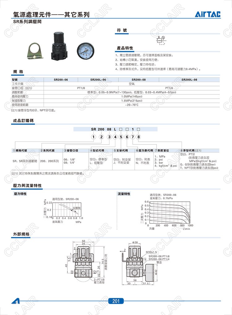 SR200-06,SR200L-06,SR200-08,SR200L-08,AIRTAC调压阀