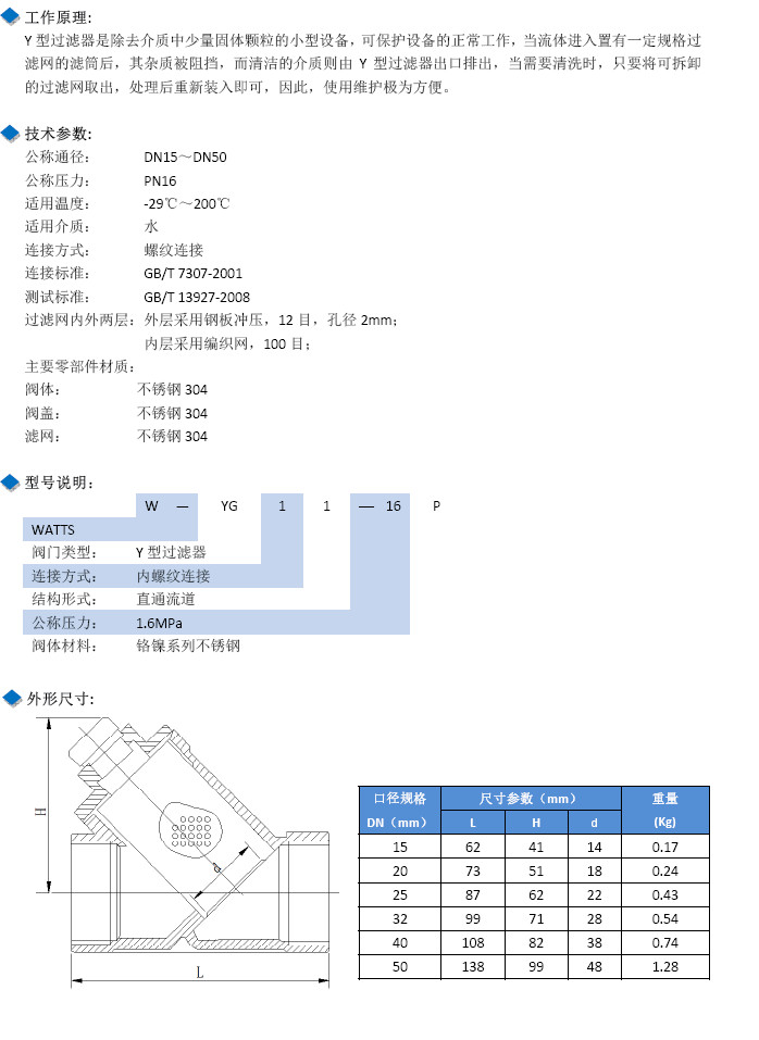 W-YG11-16P-DN15,W-YG11-16P-DN20,W-YG11-16P-DN25,不锈钢螺纹Y型过滤器