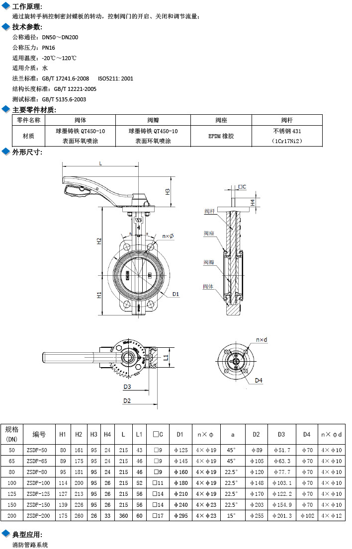 ZSDF-50,ZSDF-65,ZSDF-80,ZSDF-100,ZSDF-125,ZSDF-150,ZSDF-200,手柄式消防对夹中线蝶阀
