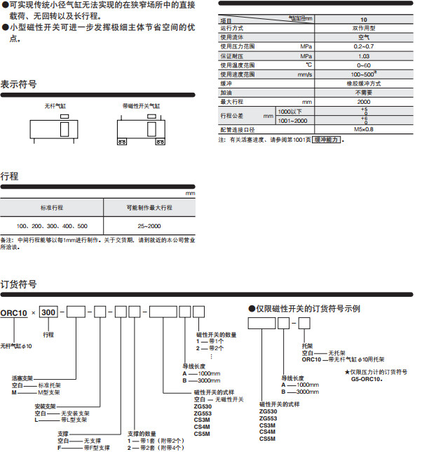 ORC10*100,ORC10*200,ORC10*300,ORC10*400,ORC10*500,开口式无杆气缸