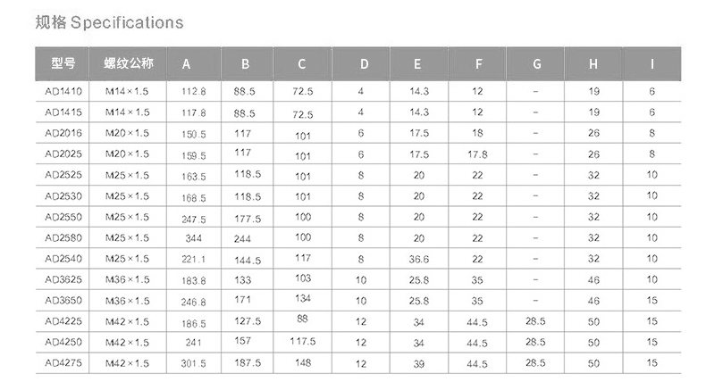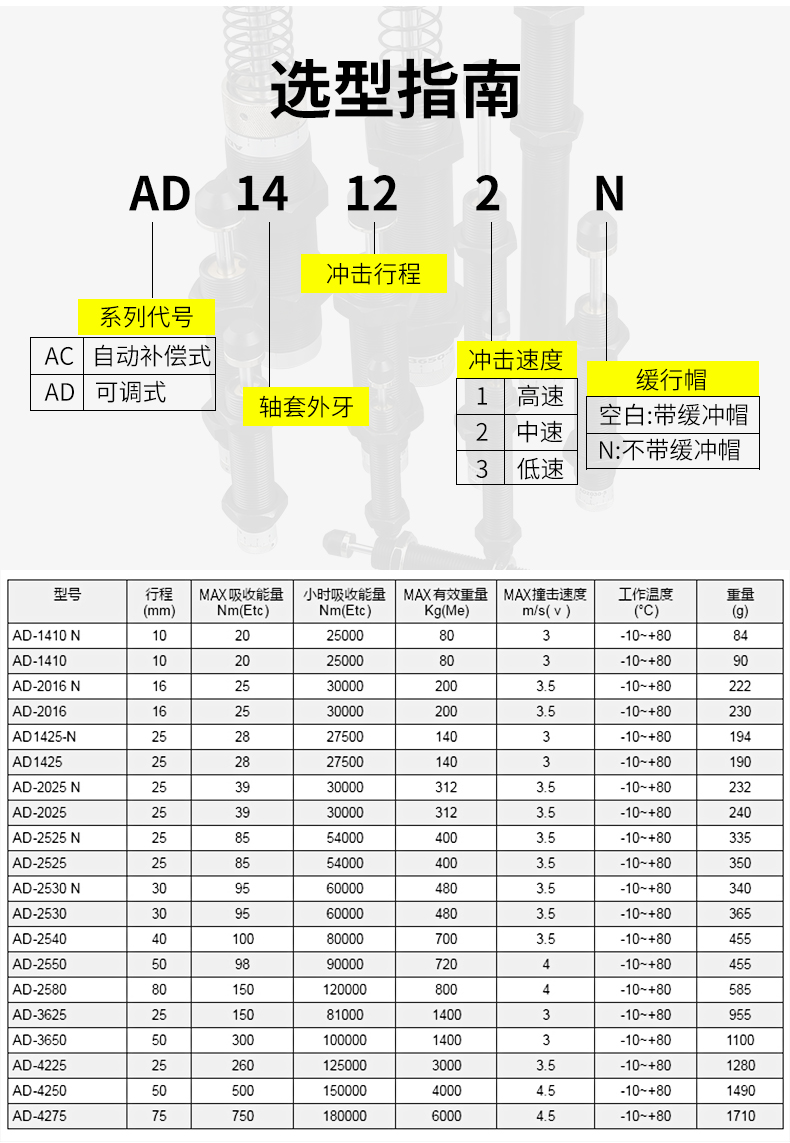 可调式油压缓冲器液压AD1410-5,AD1412-5,AD1416-5,AD2016-5,AD2020-5,AD2025-5,AD2030-5,AD1612-5,AD3625-5,AD3650-5,AD2725-5,AD2750-5,AD2050-5,AD2525-5,AD2540-5,AD2550-5,AD2580-5,AD4225-5,AD4250-5,AD4275-5,