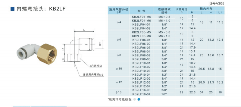 SMC型内螺弯接头KB2LF04-M5,KB2LF04-M6,KB2LF04-01,KB2LF04-02,KB2LF06-01,KB2LF06-02,KB2LF06-03,KB2LF08-01,KB2LF08-02,KB2LF08-03,KB2LF10-01,KB2LF10-02,KB2LF10-03,KB2LF10-04,KB2LF12-02,KB2LF12-03,KB2LF12-04,KB2LF16-04,