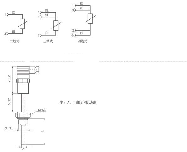 TP11包含一个PT100探头,PT100阻值会随温度变化而变化,TP11有二线式,三线式,四线式几种规格可供选择。