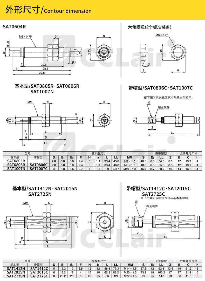 SAT-0604R,SAT-0806R,SAT-0806N,SAT-1007N,SAT-1210N,SAT-1412N,液压缓冲器,CHELIC气立可型,SAT不带缓冲头 SAT-2015N,SAT-2525N,SAT-2725N,