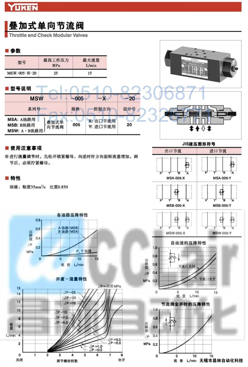 MSW-005-X-20,MSW-005-Y-20,MSA-005-X-20,叠加式单向节流阀,榆次油研叠加式单向节流阀,YUKEN叠加式单向节流阀
