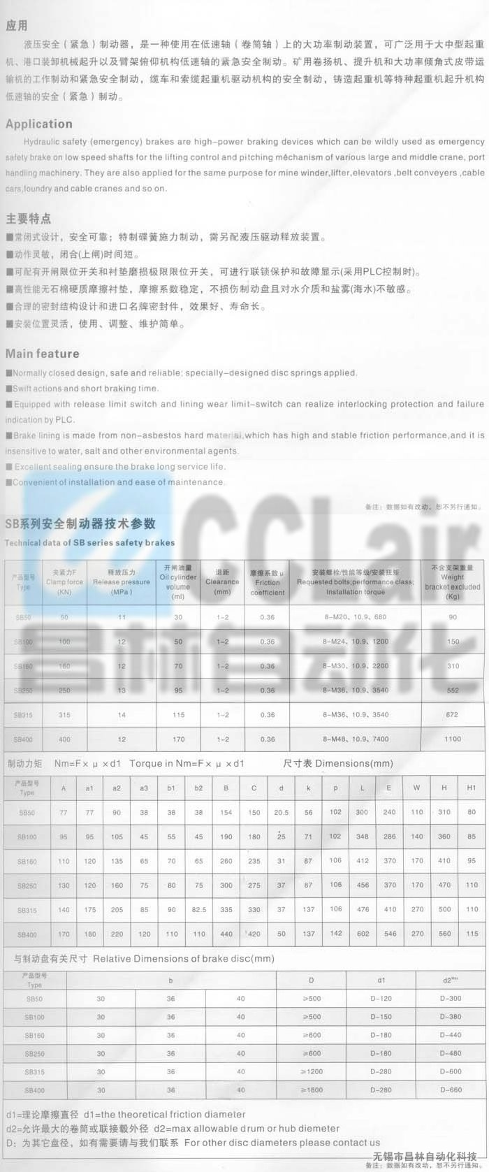 SB50,SB100,SB160,SB250,SB315,SB400,液压安全制动器