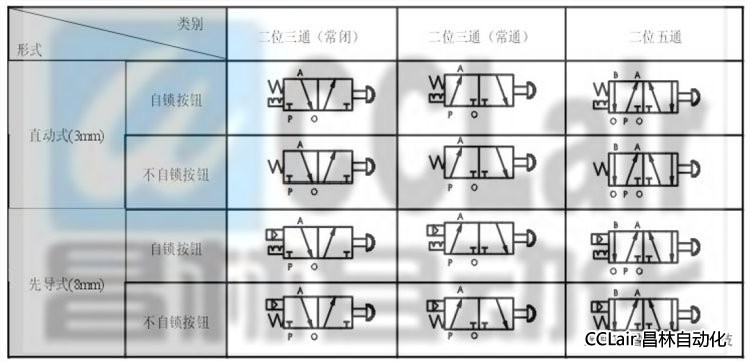 按钮式人控阀分直动式和先导式两种,主要用作控制气路的开关和改变控制气路的方向,可发出气信号给气控换向阀使其