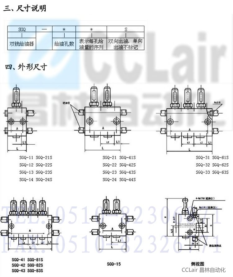 SGQ双线给油器有单向出油和双向出油二种结构形式。单向出油的给油器只有下给油孔,活塞正反排油时都由下给油孔向润滑点供送润滑脂;双向出油的给油器有上、下给油孔,活塞正反向排油时由上下给油孔交替向润滑点供送润滑脂。给油器可以从指示杆的动作直接观察到给油器的工作情况,还可以通过调节螺丝在规定范围内方便地调整各给油口的给油量。