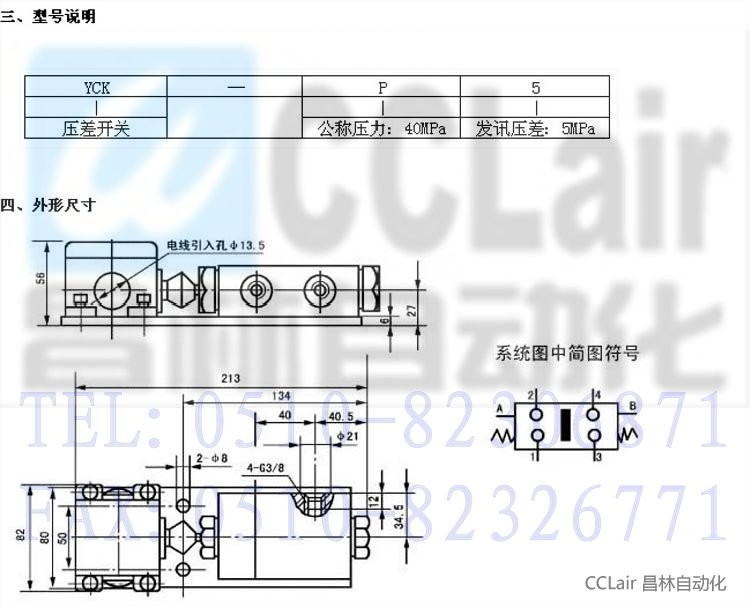 YCK-P5型(原SG-A 型)压差开关适用于公称压力为40MPa的双线式集中润滑系统中,控制换向阀或监视润滑系统,利用两条管道的压差来发出电讯号,当压差达到5MPa时,发出信号以控制换向阀换向或监视润滑系统。它一般安装在终端式双线集中润滑系统两条主管道的最末端。