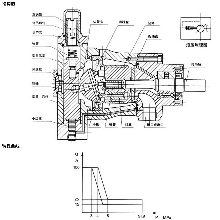 表示:排量为63毫升/转,压力为31.5MPa的手动变量的缸体旋转的轴向柱塞油泵。