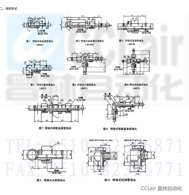 焊接式端直通管接头、焊接式端直通长管接头、焊接式直通管接头、焊接式直角管接头,焊接式四通管接头,焊接式隔壁直通管接头、焊接式隔壁直角管接头、焊接式分管管接头、焊接式铰接管接头的型式和尺寸按图1~图10 和表1的规定。