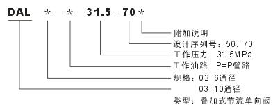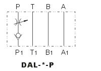 DAL型叠加式节流单向阀,它是单向阀和节流阀串联组合的一种节流单向阀,它的作用是只允许油液单方向通过并用节流阀进行流量调节,而反向则截止。