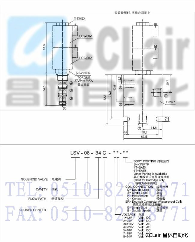 LSV-08-34C-3D,LSV-08-34C-3H,LSV-08-34C-3C,LSV-08-34C-3S,三位四通电磁阀,