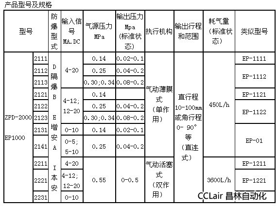例:EP1111d:表示直行程单作用,配气动薄膜式输入信号:4-20mADC