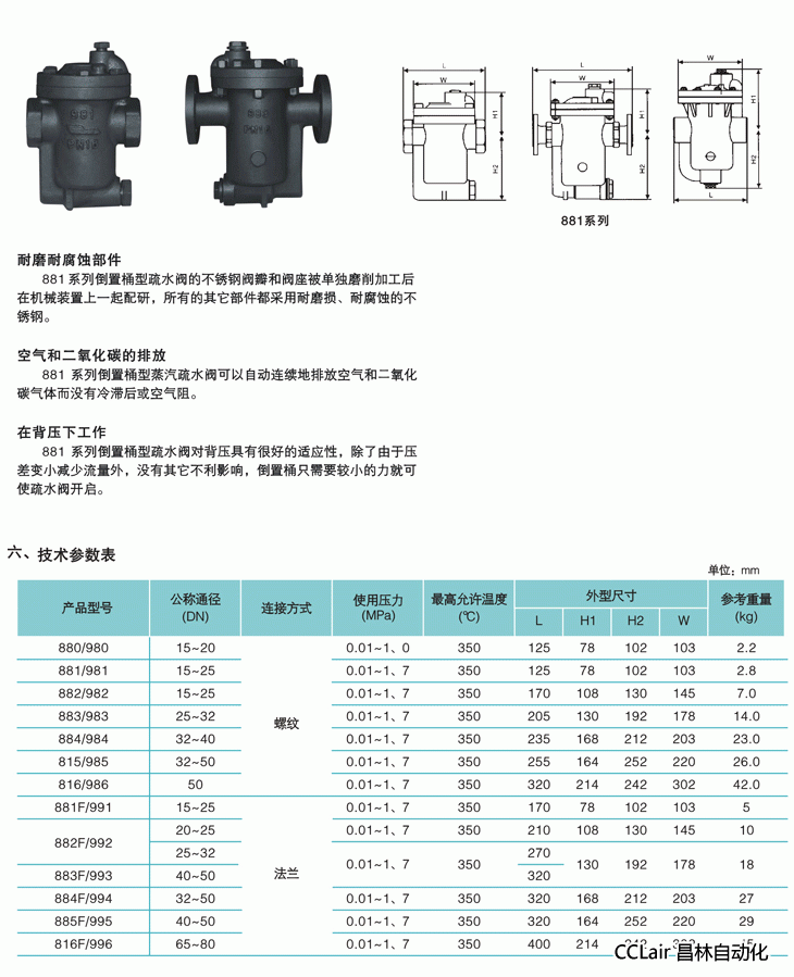 880F,881F,882F,883F,884F,885F,816F,倒置桶式蒸汽疏水阀