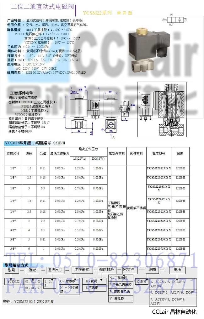 YCSM22052,YCSM22053,YCSM22061,YCSM22062,二位二通直动式电磁阀