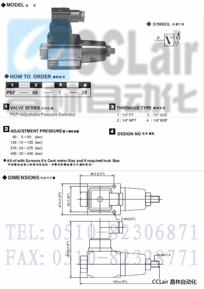 PSF-60-2-20,PSF-125-2-20,PSF-275-2-20,PSF-400-2-20,调整式压力开关,