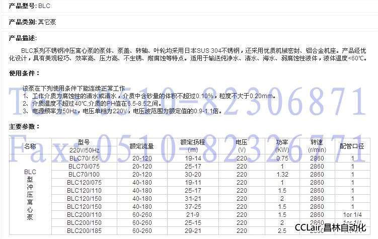 220V/50Hz,BLC70/.55,BLC70/075,BLC70/100,不锈钢冲压离心泵