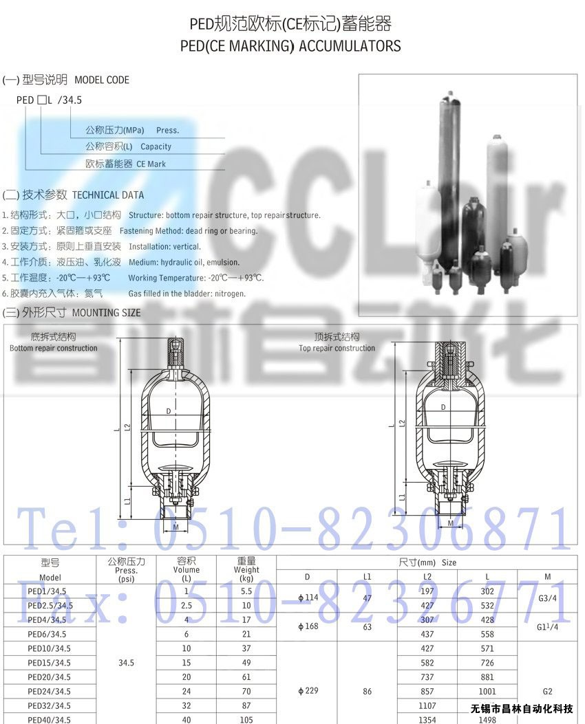 PED24/34.5,PED32/34.5,PED40/34.5,PED50/34.5,PED20/34.5,规范欧标(CE标记)蓄能器