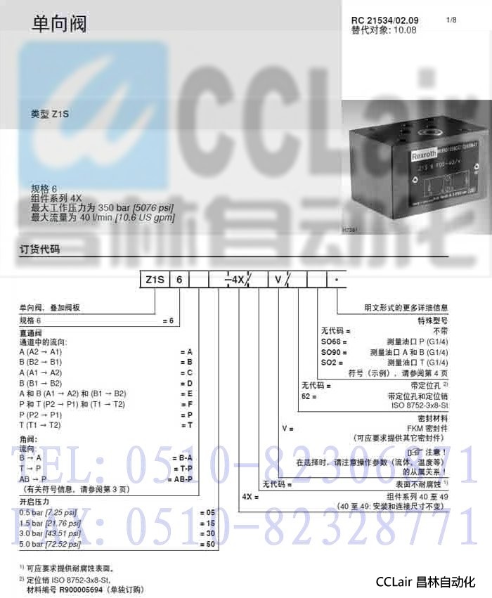 Z1S6E50-4X/V,Z1S6F50-4X/V,Z1S6F05-4X/V,Z1S6F30-4X/V,单向阀,力士乐REXROTH,德国力士乐
