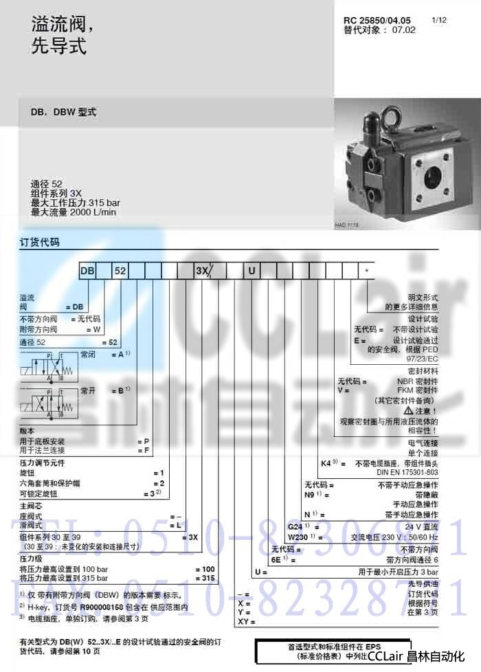 DB52F2-3X/315U,DB52F2-3X/315UV,DB52F2-3X/315XU,,先导式溢流阀,力士乐REXROTH,德国力士乐