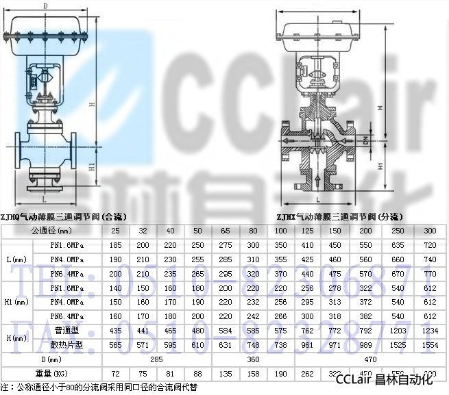 ZJHQ、ZJHX气动薄膜三通调节阀采用圆筒型薄壁窗口形阀芯导向,不同于柱塞形阀芯的衬套导向。配用多弹簧执行机构,具有结构简单、重量轻、体积小、拆装方便等优点。广泛应用于精确控制气体、液体等介质的工艺参加如压力、流量、温度、液位保持在给定值。适合于把一种流体通过三通阀分成二路流出或理把两种流体经三通阀合并成一种流体的场合。