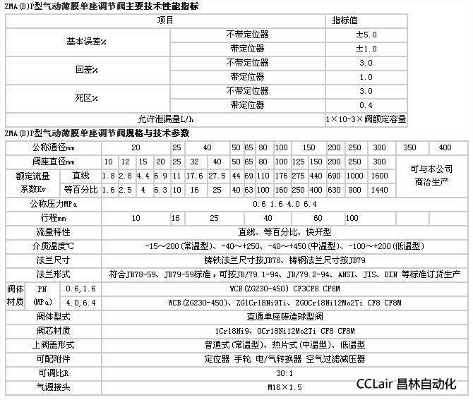 ZMA(B)P型气动薄膜单座调节阀是自动控制系统中最常用的执行器,它由气动薄膜执行机构和低流阻调节阀组成。单座适用于对泄露量求严格、阀前后压差低及有一定粘度和含纤维介质的场合;双座阀不平衡力小、允许压差大、流通能力大等特点,适用于泄露量要求不严格的场合;套筒阀具有稳定性好,不易产生震动,噪音低,对温度敏感小,适用于压差较大及泄露量要求不严格场合。