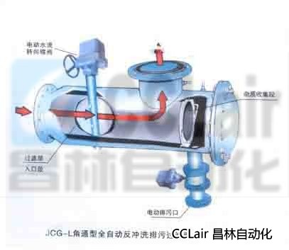 JCG型全自动反冲洗排污过滤器由壳体、不锈钢过滤网筒、杂质收集段,电动杂质排污口、电动水流转向蝶阀、检测机构、执行机构和控制箱组成。按安装型式及水流方向的不同分为直通式和角通式两种。