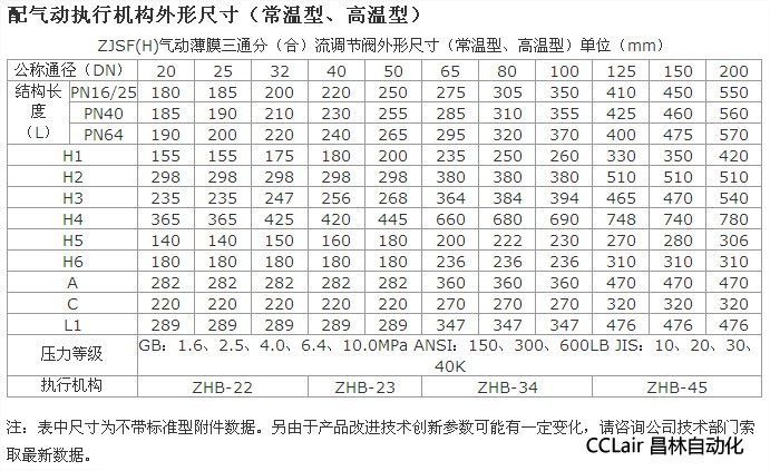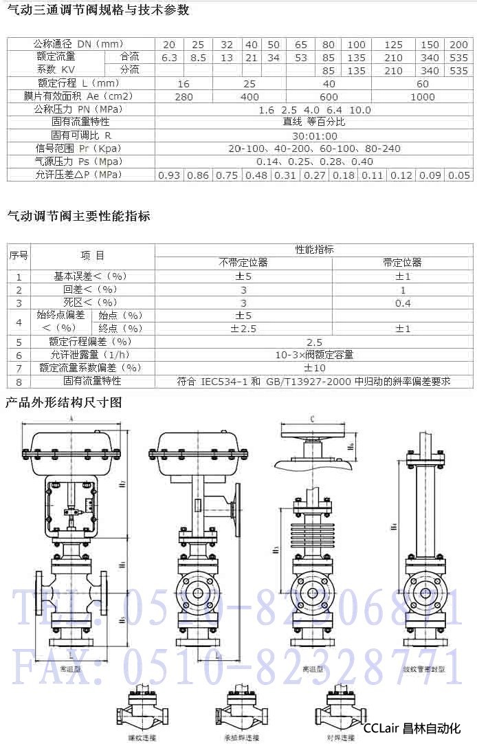ZJSF(H)气动薄膜三通分(合)流调节阀采用双阀芯上下导向结构,配用气动执行机构,阀体为三通结构,即一进两出(分流型),两进一出(合流型),从而达到流体混合升温或降温,或流体不等量分流,满足不同工矿的使用要求。该阀体具有结构紧凑、重量轻、动作灵敏、压降损失小、阀容量大、流量特性精确和维修方便等优点。可用于各种不同的工作条件,特别适用于石油工业热交换器的温度控制系统和其他的各行业的自动化控制系统。本系列产品有常温型、高温型、低温型、调节切断型、波纹管密封型等多种型式。产品公称压力等级有PN1.6、4.0 6.4;阀体口径范围DN20-DN300;适用流体温度-150℃-+560℃范围内多种档次;泄露等级氛分为Ⅳ级、Ⅴ级、Ⅵ级;流量特性有直线、等百分比。多种规格可供选择。本系列调节阀采用模块化设计,可采用不同组合、配用各种附件。