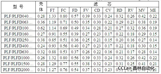 4、额定流量下的清洁滤芯压降(单位:1×105Pa 介质参数:2/s 0.86kg/dm3)