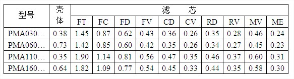 4 额定流量下的清洁滤芯压降(单位:1×105Pa 介质参数:30mm2/s 0.86kg/dm3)