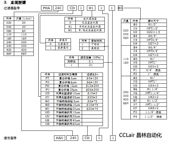 3 额定流量下的清洁滤芯压降(单位:1×105Pa 介质参数:30mm2/s 0.86kg/dm3)