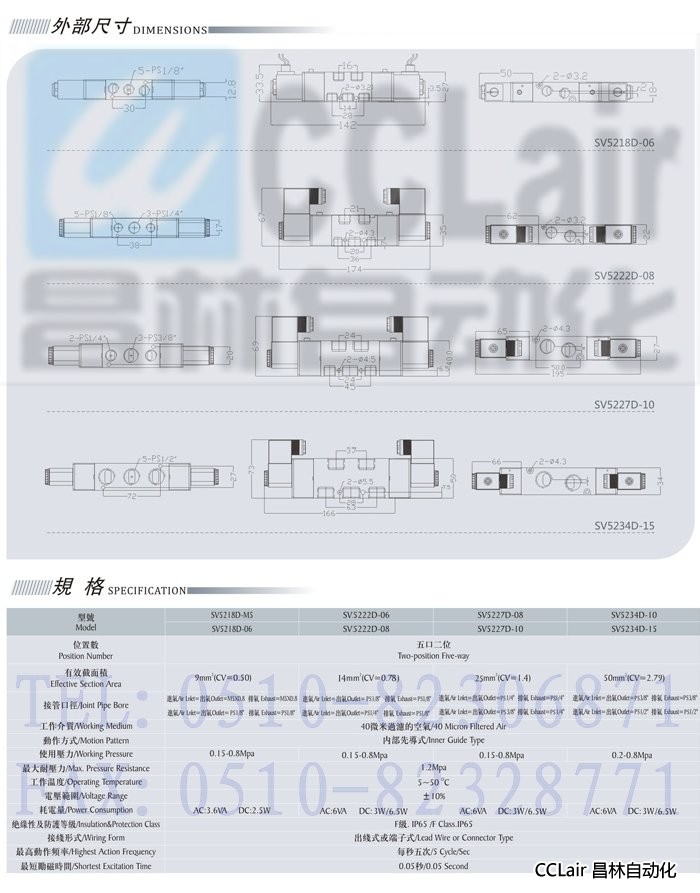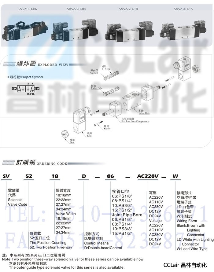 SV5222D-08,SV5222D-06,SV5218D-M5,SV5218D-06,五口二位电磁阀
