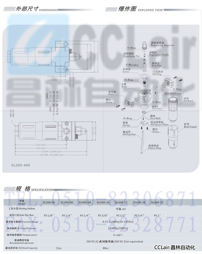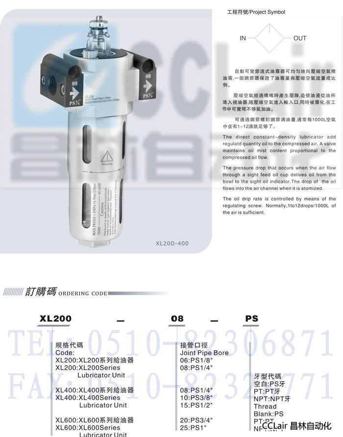 XL200-06,XL200-08,XL400-08,XL400-10,XL400-15,XL600-20,XL600-25,给油器