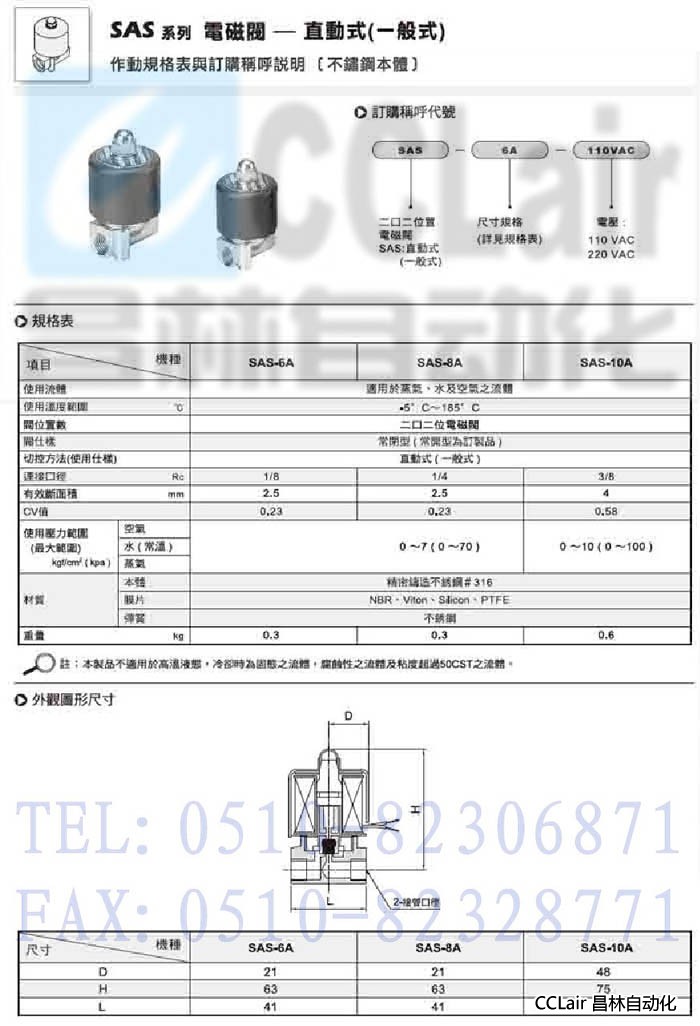 SAS-6A,SAS-8A,SAS-10A,直动式电磁阀