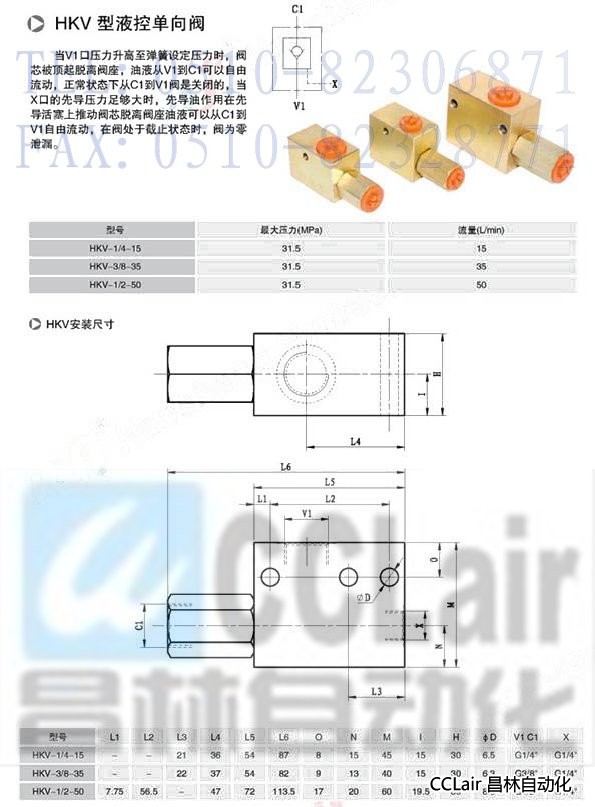 HKV-1/4-15,HKV-3/8-35,HKV-1/2-50,液控单向阀
