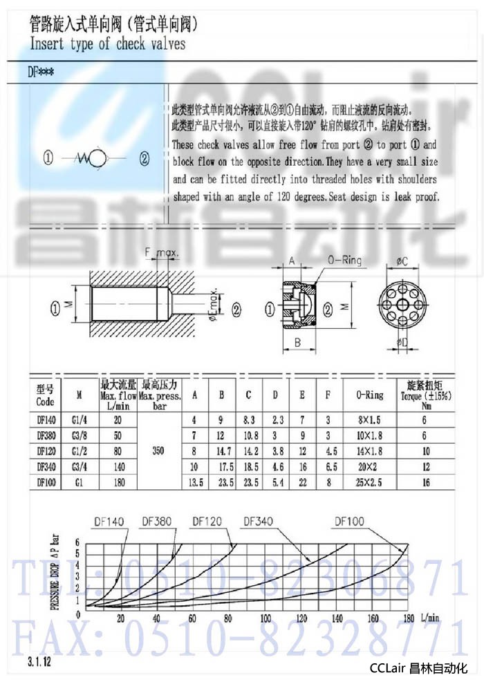 DF140,DF380,DF120,DF340,DF100,管路旋入式单向阀