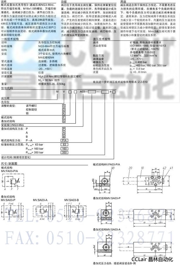 MV.FA03-P/A,MV.SA03-P,MV.SA03-A,MV.SA03-B,先导式减压阀板式和叠加式结构