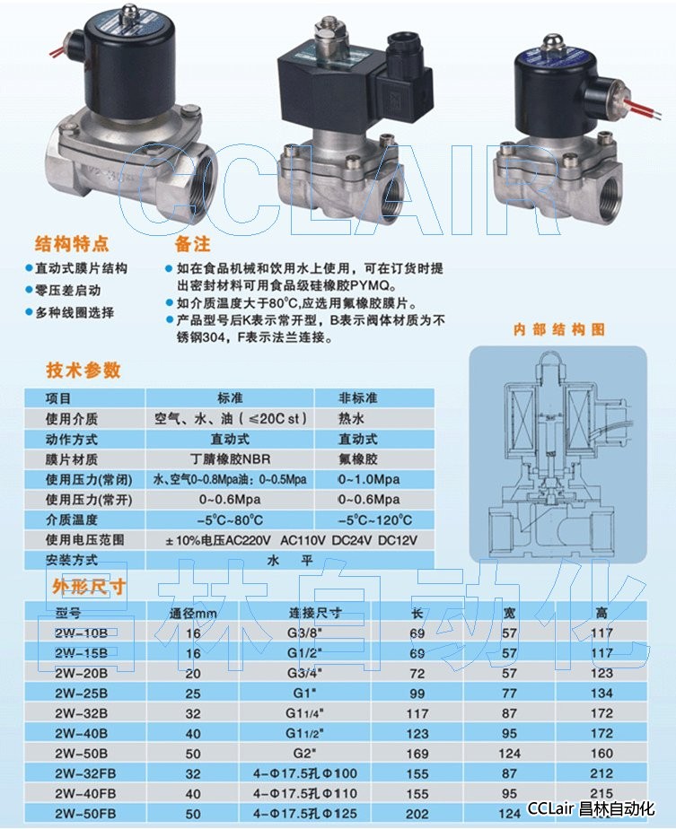 2W-10B,2W-15B,2W-20B,2W-25B,2W-32B,2W-40B,2W-50B,直动式膜片电磁阀