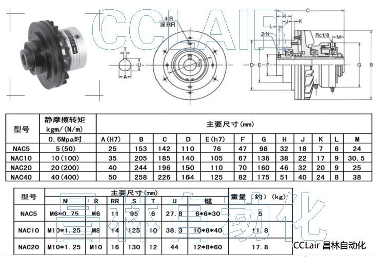 NAC6,NAC10,NAC20,NAC40,(标准型)空压通轴式离合器