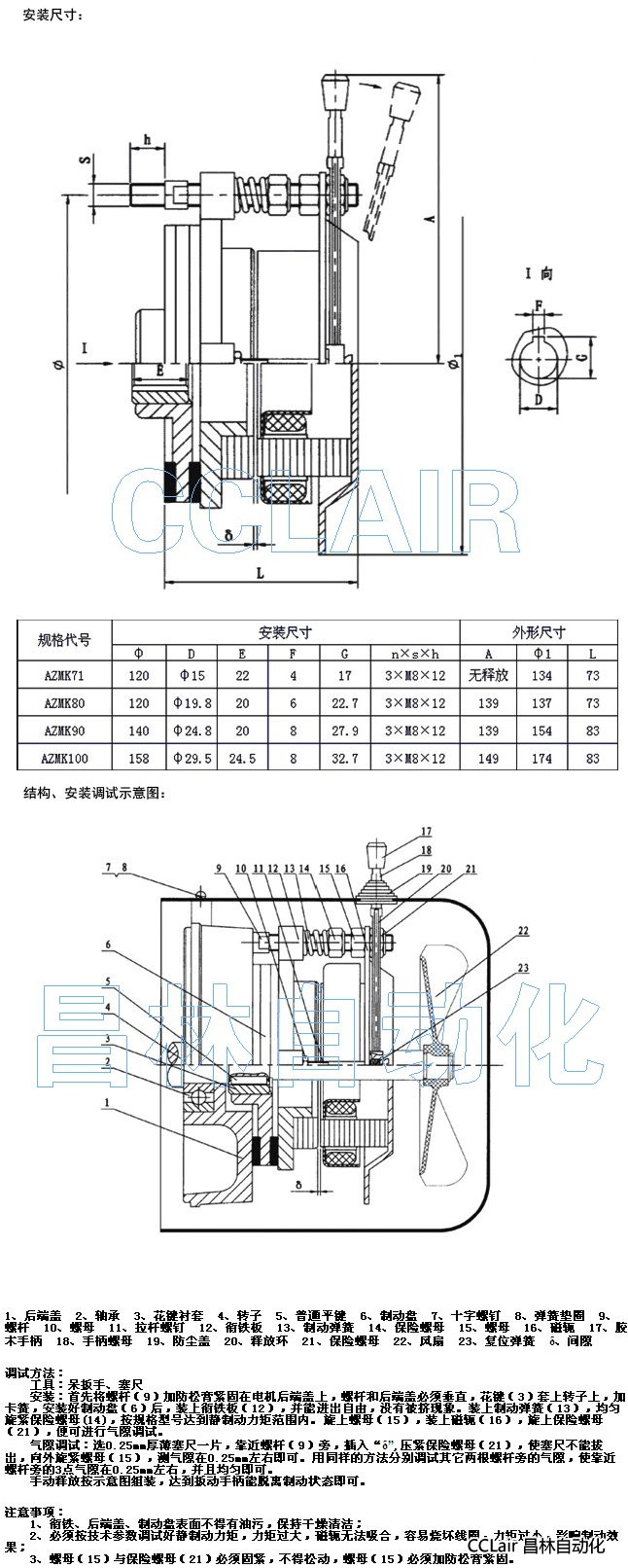 安装:首先将螺杆(9)加防松膏紧固在电机后端盖上,螺杆和后端盖必须垂直,花键(3)套上转子上,加卡簧,安装好制动盘(6)后,装上衔铁板(12),并能进出自由,没有被挤现象。装上制动弹簧(13),均匀旋紧保险螺母(14),按规格型号达到静制动力矩范围内。旋上螺母(15),装上磁轭(16),旋上保险螺母(21),便可进行气隙调试。