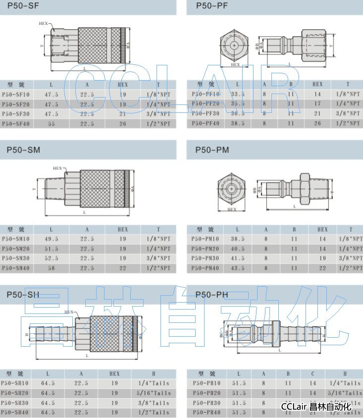 P50-SF10,P50-PF20,P50-SM30,P50-PM40,P50-SH10,P50-PH20,美式快换接头