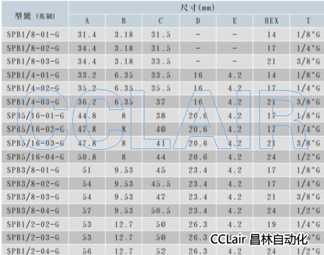 SPB1/8-01-G,SPB1/4-02-G,SPB5/16-01-G,SPB3/8-01-G,SPB3/8-03-G,SPB1/2-04-G,接头