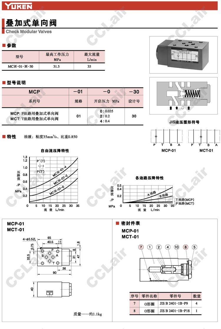 MCP-01-0-30,MCP-01-2-30,MCP-01-4-30,MCT-01-0-30,MCT-01-2-30,MCT-01-4-30,叠加式单向阀,YUCIYUKEN榆次油研
