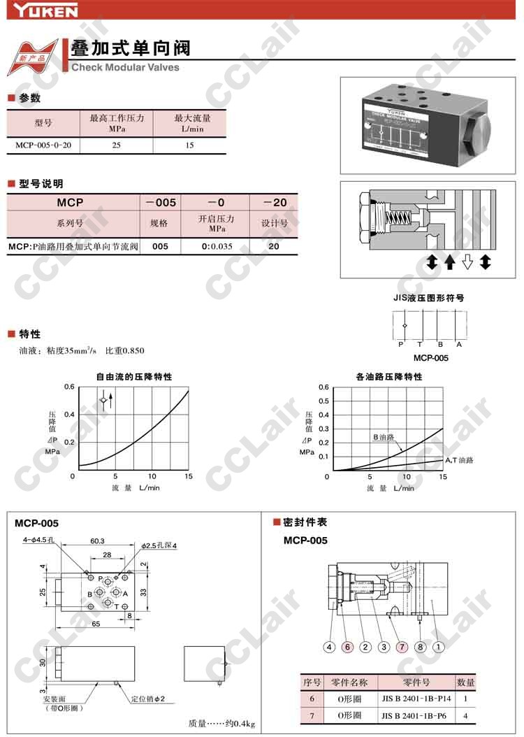 MCP-005-0-20,叠加式单向阀,YUCIYUKEN榆次油研
