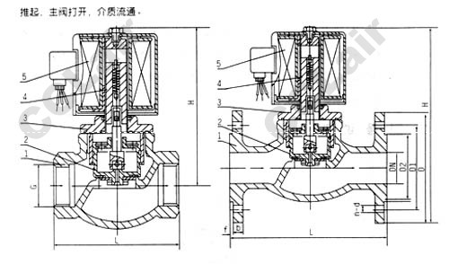 本阀为分步动作直接先导式电磁阀,可根据断电时所处开、关状态的不同,可分为常闭式电磁阀和常开式电磁阀。常闭电磁阀,线圈通电后,衔铁在电磁力作用下先带动副阀阀塞提起,主阀阀杯上的流体经副阀流走,减少了作用在主阀阀杯上的压力,当主阀阀杯上的压力减少到一定值时,衔铁带动主阀阀杯,并利用压差而使主阀阀杯启,介质流通。线圈断电后,电磁力消失,衔铁因自重下落复位。同时依靠介质压力,主副阀得以紧密关闭。常开电磁阀,线圈通电后由于吸力作用,动铁芯下移,把副阀阀塞压下,副阀关闭,主阀阀杯内压力上升,当压力升到一定值时,主阀阀杯的上下压差一样,由于电磁力作用,动铁芯失去主阀阀杯下,压紧主阀阀座,阀门关闭。线圈断电时,电磁吸力为零,副阀阀塞和支铁芯由于弹簧作用向上提起,副阀打开,主阀阀杯上的流体经副阀流走,减少了作用在主阀阀杯上的压力,当主阀阀杯上的压力减少到一定值时,利用压差把主阀阀杯推起,主阀打开,介质流通。