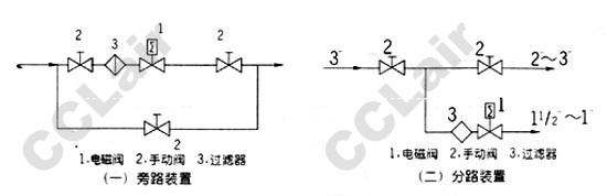 3、在电磁阀发生故障时,为了及时隔离电磁阀,并保证系统正常运行,最好安装旁路装置(如图一)。