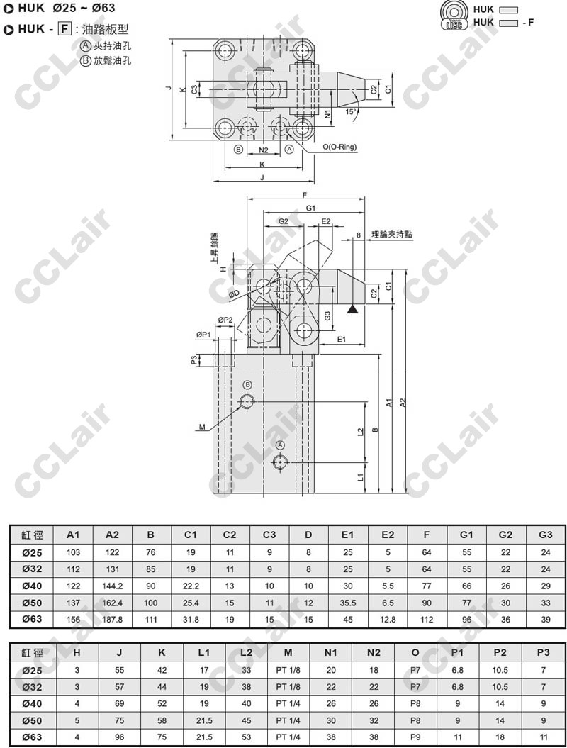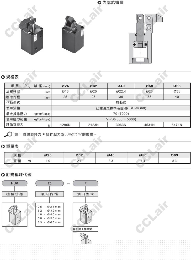 气立可(chelic),HUK-25,HUK-32,HUK-40,HUK-50,HUK-63,HUK-25-F,HUK-32-F,HUK-40-F,HUK-50-F,HUK-63-F,油压压紧缸