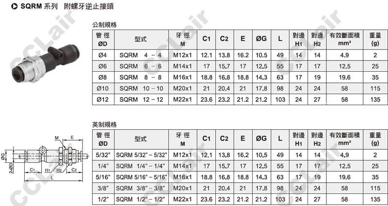 SQRM5/32-5/32,SQRM1/4-1/4,SQRM5/16-5/16,SQRM3/8-3/8,SQRM1/2-1/2,SQRM6-6,SQRM8-8,SQRM10-10,SQRM12-12,附螺牙逆止接头