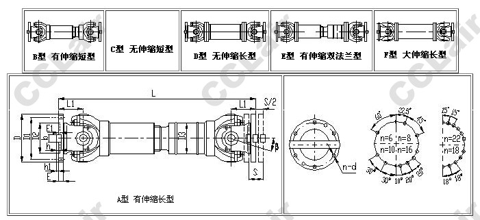 | 型号 | 回转直径D | 公称转矩Tn KN.m | 疲劳转矩Tn KN.m | 轴线折角 < | 标准伸缩量 S | 尺寸 mm | ||||||||